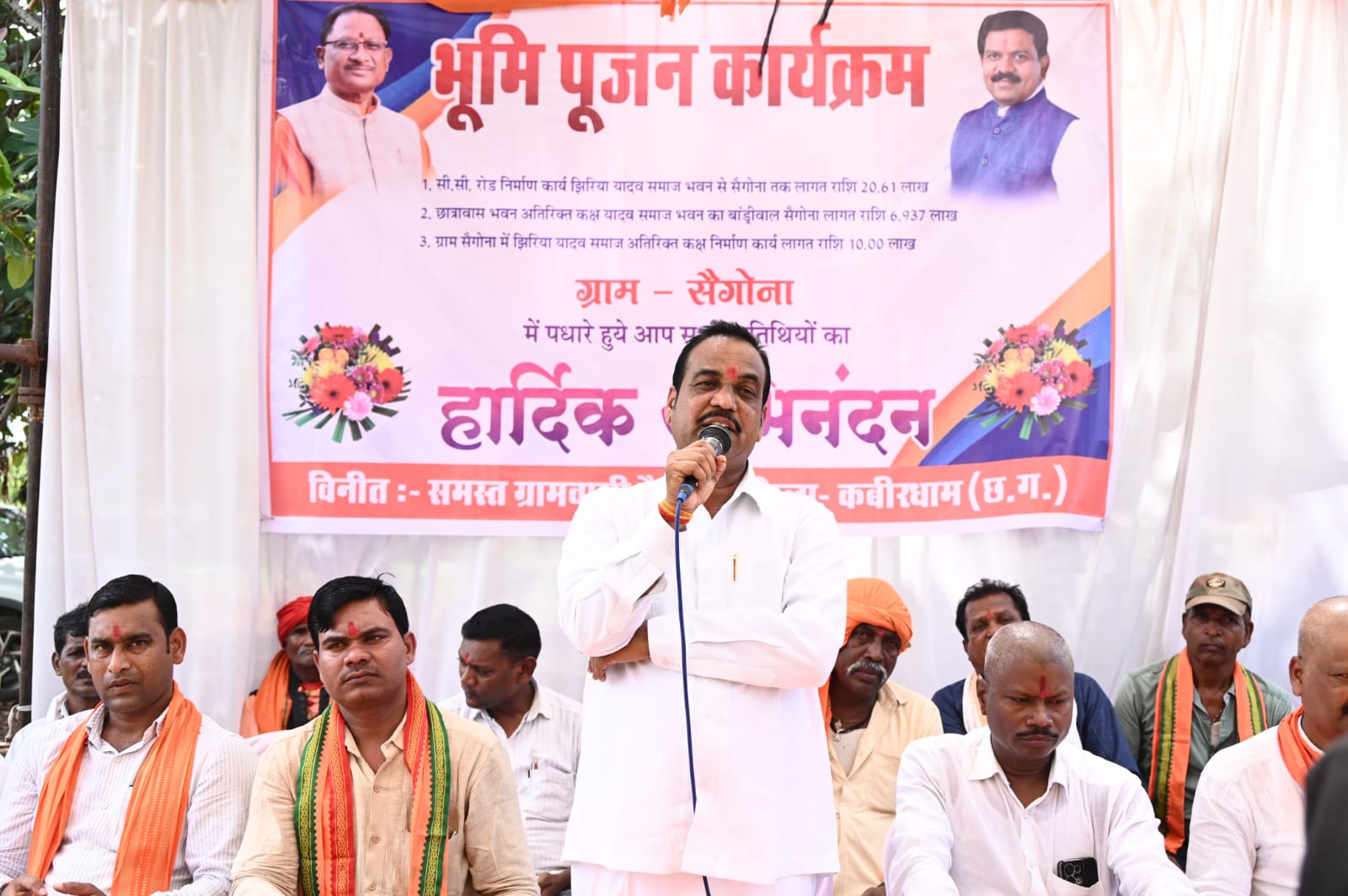 कवर्धा। उपमुख्यमंत्री एवं कवर्धा विधायक श्री विजय शर्मा के नेतृत्व में कवर्धा विधानसभा क्षेत्र चहुंमुखी विकास की ओर तेजी से अग्रसर है। उपमुख्यमंत्री श्री शर्मा की विकासपरक सोच और प्रतिबद्धता के अनुरूप ग्राम सैगोना में विभिन्न निर्माण कार्यों की विधिवत भूमिपूजन हुई। उपमुख्यमंत्री श्री विजय शर्मा ने अपने क्षेत्रीय भ्रमण के दौरान ग्राम सैगोना में विभिन्न निर्माण कार्यों की घोषणाएं की थीं, जिनकी स्वीकृति अब प्राप्त हो चुकी है। इसी क्रम में 06 अगस्त को ग्राम सैगोना में 37 लाख 54 हजार 700 रुपये की लागत से स्वीकृत निर्माण कार्यों का विधिवत पूजा-अर्चना कर भूमिपूजन किया गया। भूमिपूजन कार्यक्रम में जिला पंचायत अध्यक्ष श्री ईश्वरी साहू, स्थानीय जनप्रतिनिधियों और ग्रामवासियों की उपस्थिति में तीन प्रमुख कार्यों की आधारशिला रखी गई।