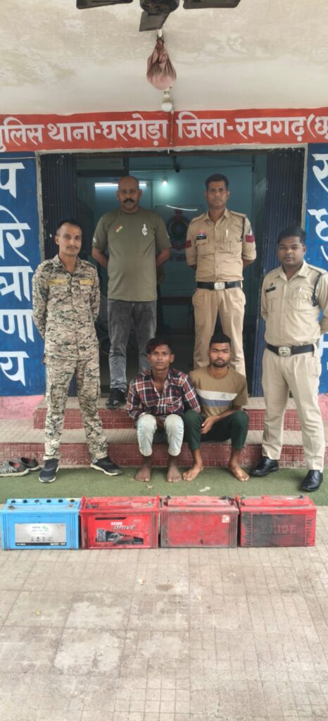 घरघोड़ा, रायगढ़।थाना घरघोड़ा पुलिस ने क्षेत्र में बढ़ रही बैटरी चोरी की घटनाओं पर लगाम कसते हुए दो सक्रिय चोरों को गिरफ्तार करने में सफलता पाई है। गिरफ्तार आरोपियों से कुल चार बैटरियां बरामद की गई हैं, जिनकी अनुमानित कीमत करीब ₹30,000 बताई गई है। पुलिस ने दोनों आरोपियों को न्यायिक रिमांड में जिला जेल रायगढ़ भेज दिया है।