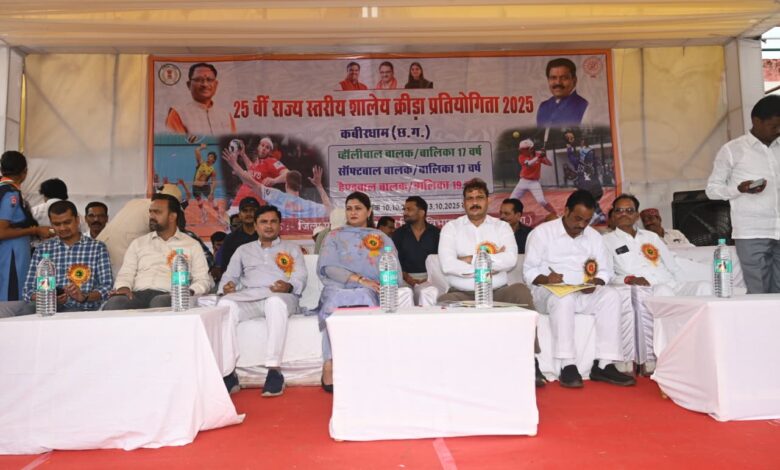 कवर्धा, 10 अक्टूबर 2025। जिले में चार दिवसीय 25वीं राज्य स्तरीय शालेय क्रीड़ा प्रतियोगिता 2025 का भव्य शुभारंभ आज स्वामी करपात्री स्टेडियम कवर्धा में हुआ। कार्यक्रम का शुभारंभ मुख्य अतिथि पंडरिया विधायक श्रीमती भावना बोहरा ने माँ सरस्वती के तैलचित्र पर दीप प्रज्ज्वलन कर किया। इस अवसर पर जिला पंचायत अध्यक्ष श्री ईश्वरी साहू, श्री राजेन्द्र चन्द्रवंशी, पूर्व जिला पंचायत अध्यक्ष श्री विदेशी राम धुर्वे, पूर्व जिला पंचायत अध्यक्ष श्री संतोष पटेल, कलेक्टर श्री गोपाल वर्मा सहित जनप्रतिनिधि, अधिकारी एवं खेलप्रेमी बड़ी संख्या में उपस्थित रहे।
